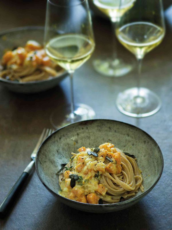 Pasta auf Tellern anrichten und Kürbissauce darübergeben.