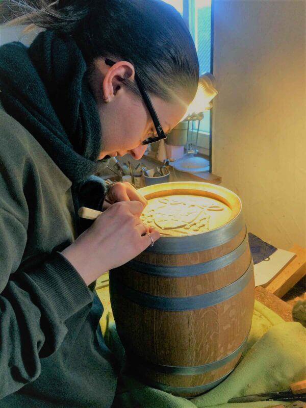 Die Geduld der Künstlerin Johanna Helle mit Schnitzeisen feinste Konturen in das Eichenfass zu zaubern ist bewundernswert.